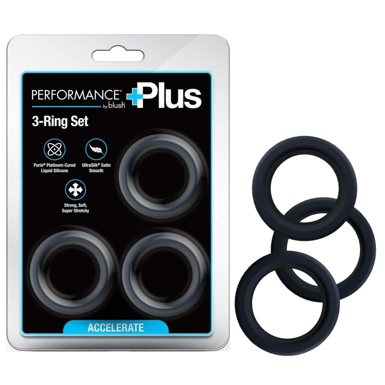 Maximize and boost pleasure with Performance Plus Accelerate! This premium versatile 3-ring cock ring or ball stretcher set strengthens stamina, maintains firmer erections, and extends playtime. Made with strong, soft, super stretchy Purio®, platinum-cured liquid silicone and wrapped in UltraSilk®, it adapts to all sizes for ultimate control and comfort.