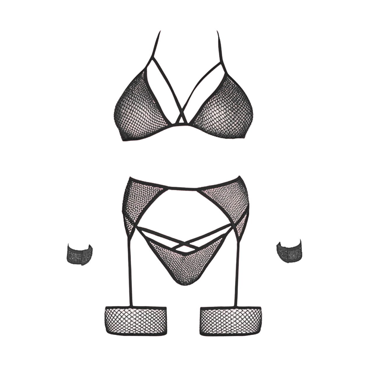 EL PAQUETE INCLUYE: top bralette, braguita, arnés y correas para las muñecas.