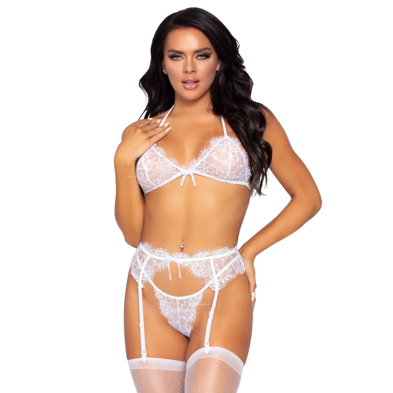 Flirty looks with a naughty side, this 3 PC lingerie set is sure to get things hot. This sultry lace lingerie look features a gorgeous rhinestone bra with a mini bow accent and tie-back straps, matching thong panties, and sexy garter belt with adjustable straps. (Stockings not included)